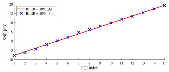 From the AWGN curve shown in Figure 4, SINR threshold at BLER = 0.1 (10%) can be derived, as shown in Table 5. In practical 4G/5G systems, if an estimated BLER exceeds 0.1, TB transmission is considered as failure. Otherwise, TB transmission is considered as success. We plot SINR threshold at BLER = 10% for the range of all CQIs in Figure 6. From this plot, we derive a linear equation as follows: