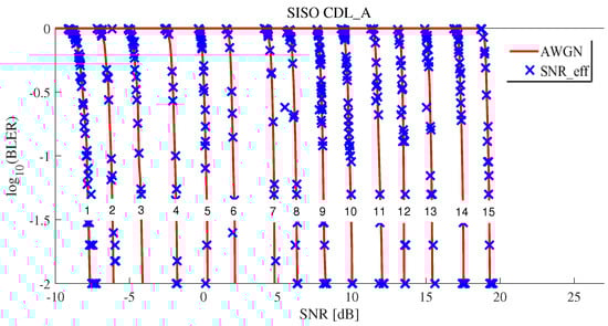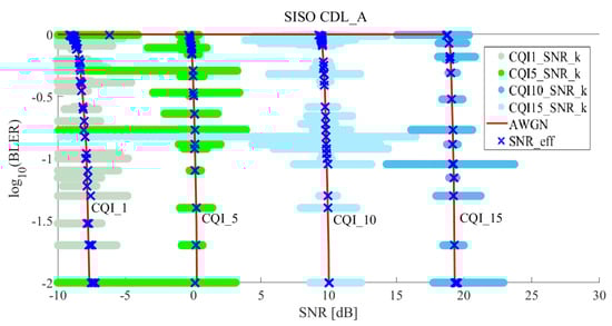 Figure 7 and Figure 8 show the results of effective SNR mapping by the proposed ML-based EESM method in the case of 5G CDL-A SISO. “CQI1_SNR_k”, “CQI5_SNR_k”, “CQI10_SNR_k”, and “CQI15_SNR_k” indicate the post-processing SINRs , as mentioned in Equation (6). Since the number of allocated REs was 300 (25 RB × 12 sub-carriers × 1 symbol time = 300 REs), corresponding to are plotted in Figure 7. When wide-band signal passed through a fading channel, each RE suffered different fading. Thus, the results show that s spread widely. AWGN indicates SNR and BLERs at CQI 1, 5, 10 and 15 in 5G NR AWGN, as shown in Figure 5. To perform EESM L2S mapping, we applied optimal parameters of and obtained using RMSProp optimizer, as shown in Table 6. Blue mark presents effective SNRs and the results show that widespread were mapped to one effective SNR on the AWGN curve. Figure 8 shows how well is the effective SNR mapped to the AWGN for all CQIs. The results show that most blue marks were on the AWGN line. With these results, we observed that the proposed method predicted the BLER quite well.