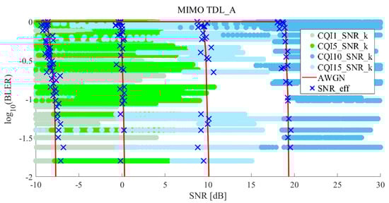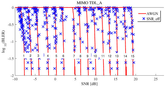 Figure 9 and Figure 10 show the results of effective SNR mapping by the proposed ML-based EESM method in the case of 5G TDL-A 2 × 2 MIMO. MIMO cases were also similar to SISO cases from the analytical point of view. As shown in Figure 9, were more widespread compared to SISO case shown in Figure 9. Therefore, since the variance of was larger than that of SISO, MSE of MIMO was also larger than that of SISO. Figure 10 shows how well is the effective SNR mapped to the AWGN for all CQIs under MIMO. Compared to SISO results, there were a few blue that were slightly off the AWGN line.