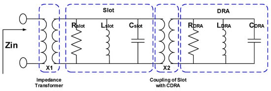 The equivalent circuit model for the proposed CDRA along with the transmission line and a rectangular slot are shown in Figure 2. In the equivalent circuit model, the impedance transformer represents the 50 Ω transmission line which excites the rectangular slot. Rectangular slot as well as cylindrical DRA is represented with the RLC resonator. The rectangular slot is responsible for installing the H E M 11 mode in the CDRA. In order to see the validity of the circuit model, the impedance and return loss plots are compared with the EM model. A decent agreement between the real part, imaginary part of the impedance and return loss of the circuit model and EM model is obvious from Figure 3. The optimized values for circuit model ( X 1 , X 2 , R s l o t , L s l o t , C s l o t , R D R A , C D R A and L D R A ) are listed in Table 1. The E and H fields of H E M 11 mode excited in the CDRA are shown in Figure 4.