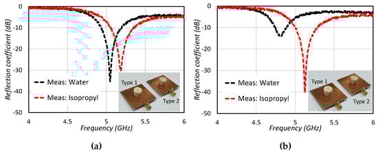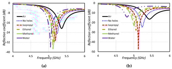 The design of this type of sensor is shown in Figure 5a. A cylindrical dielectric resonator antenna is used as a sensing element in this work. A High-Frequency Structure Simulator (HFSS v13.0) is used for designing and optimization purposes. A cylindrical microwell with PDMS is installed in the center of the CDRA for the liquid under test (LUT). A microwell using PDMS values is extracted so as to give proper physical structure in simulations. A large number of simulations have been performed so as to find the optimized radius and height of the microwell basin, keeping in mind the unloaded quality factor of the dielectric resonator as well as the sensing capabilities. It is always desirable for an RF sensor to have a high quality factor so as to intelligently sense dielectric materials of a high dielectric constant value. The optimized microwell basin has the height of 6 mm and radius of 2 mm. The reflection coefficient graphs for the type 1 sensor are given in Figure 6a. Four different types of liquid chemicals (Isopropyl, ethanol, methanol and water) are tested in the designed sensor and their results are shown in Figure 6a. It is clear from Figure 6a that the designed sensor behaves differently for all the liquid chemicals based on their dielectric constant value. The designed sensor is tested under six different conditions: one without PDMS microwell, second with no liquid in the basin, and then testing of four different liquid chemicals. The proposed CDRA has a resonance frequency of 5.25 GHz in the absence of microwell for liquid chemical sensing. The resonance frequency of the CDRA shifts to 5.36 GHz when the microwell is designed at the center of the CDRA. The right hand shift of the resonance frequency of the CDRA is due to the low permittivity of the air inside the microwell. When the microwell is filled with isopropyl, the resonance frequency shifts towards the lower frequency side and noted at 5.16 GHz. The frequency shift of the resonance frequency of CDRA is because of the higher dielectric constant of the isopropyl chemical than the CDRA and air [22]. The resonance frequency of the CDRA sensor is noted at 5.152 GHz, when the ethanol liquid chemicals is tested in the microwell. The resonance frequency shifts to 5.12 GHz for methanol testing. In the case of testing water in the type 1 sensor, the resonance frequency shifts to 5.048 GHz. The large shift of the resonance frequency of type 1 sensor is because of the large dielectric constant value of the water. In this way, the proposed model can be utilized as a sensor using the varying behavior of the resonance frequencies for different liquid chemicals.