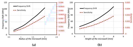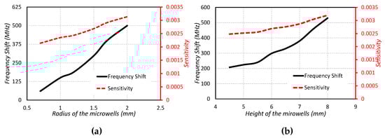 The sensing capabilities and frequency shift against the varying radius and height of the microwell is investigated in Figure 7a,b. The following relations are used for determining the fractional change in frequency and the sensitivity [2].