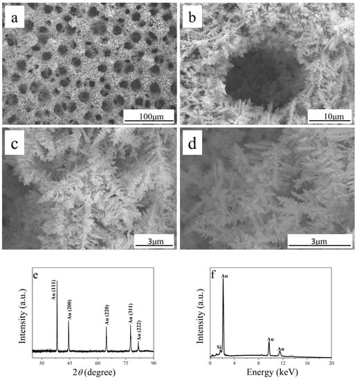 SEM was used to examine the surface morphologies and microstructures of the obtained Au foam samples. In the process of the electrodeposition of Au, the highly negative potential of −4 V ensured the production of dense bubbles, which provided a dynamic template for Au deposition [30]. Specifically, the H2 and NH3 generated by H2SO4 and NH4Cl at a high overpotential formed bubbles on the surface of the Au/Si substrate, and the bubbles gradually became larger, before becoming detached from the surface. At the same time, Au was reduced and dendrites grew, with the formation of a foam structure. Figure 1a shows that the Au foam had a three-dimensional honeycomb structure containing a large number of uniform pores. The Au foam, therefore, had a large surface area and a large number of active sites for glucose oxidation. The magnified image of a pore in Figure 1b shows that the wall consisted of dendrites. Figure 1c shows the pore wall morphology. Au dendrites also formed inside the pores (Figure 1d). The XRD pattern (Figure 1e) of the Au foam shows peaks at 38.2°, 44.6°, 64.6°, 77.6°, and 81.7°, which corresponded to the (111), (200), (220), (311), and (222) crystal faces, respectively, of Au (JCPDS 04-0784). The diffraction peaks from Si were not present, which indicated that Au was well deposited on the Au/Si substrate. The elemental composition of the porous structure was determined by EDS. Figure 1f shows that the peaks from Au were much stronger than those from Si, which shows that a dense Au layer covered the Au/Si substrate. These results clearly show the successful fabrication of Au foam.