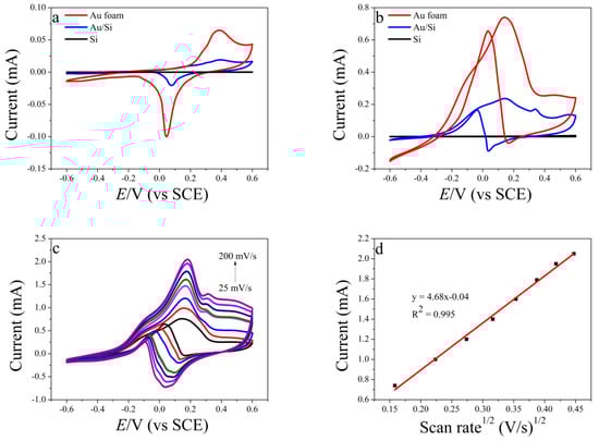 (a) Cyclic voltammetry (CV) curves for Au foam, Au/Si, and Si in 0.3 M NaOH at scan rate of 25 mV·s−1, (b) CV curves for glucose oxidation on Au foam, Au/Si, and Si in 0.3 M NaOH containing 5 mM glucose at scan rate of 25 mV·s−1, (c) CV curves of Au foam at various scan rates, (d) plot of peak current vs. square root of scan rate.