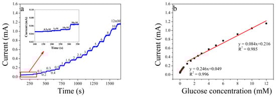 The quantitative detection of glucose with Au foam was investigated amperometrically by plotting current–time (i–t) curves for various concentrations of glucose at a constant voltage. The applied potential significantly affects the sensitivity and selectivity of a glucose sensor. When the potential is less than 0 V, the current intensity increases with increasing glucose concentration first, but it will decrease rapidly if the glucose concentration continues to increase because of the incomplete oxidation of glucose [35]. Therefore, the potential should be larger than 0 V to ensure sensitivity. However, if the applied potential is too high, the selectivity will be affected. This effect is caused by interference from species in human serum, such as uric acid, ascorbic acid, dopamine, and acetaminophen, which are oxidized at the electrode surface at an applied potential of 0.2 V [36]. A potential of 0.1 V was therefore chosen for determining the amperometric responses at the different concentrations of glucose. At this applied voltage, various concentrations of glucose were injected under stirring into 0.3 M NaOH solution at 50 s intervals. Figure 3a shows the i–t curves for the amperometric responses. The figure shows that when glucose was injected, the current increased. The two linear ranges, as shown in Figure 3b, can be identified in Figure 3a. For the range of 0.5 μM to 1 mM, the linear regression equation is i (mA) = 0.246 × C [glucose] (mM) + 0.049 (R2 = 0.996), and for the range of 1 to 12 mM, the equation is i (mA) = 0.084 × C [glucose] (mM) + 0.216 (R2 = 0.985). The sensitivity of the sensor was also examined. According to the definition of the International Union of Pure and Applied Chemistry (IUPAC) [37], the limit of detection (LOD) is estimated to be 3 times the signal-to-noise ratio. 3σ, where σ is the standard deviation of seven independent measurements for a blank sample, was introduced into the linear relationship equation for the low concentration region (i (mA) = 0.246 × C [glucose] (mM) + 0.049) to obtain the detection limit of glucose. The results of the seven blank measurements were 0.04703, 0.06548, 0.02509, 0.05956, 0.03348, 0.02758, 0.05661 mA, giving σ = 0.016345, so the LOD was determined to be 0.14 μM. This LOD was lower than those for most other sensors because of the large surface area, and abundant active sites on the Au foam.