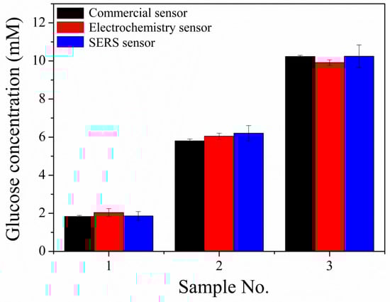 The applicability of Au foam as an electrochemical glucose sensor was further investigated by comparing the results from a commercial sensor, our electrochemical sensor, and our previously reported Surface Enhanced Raman Scattering (SERS) sensor for detection of various concentrations of glucose in human serum. The commercial sensor used was the Blood Glucose Meter 580 from Shanghai Yuyue Medical Equipment Co., Ltd. Following the instrument instructions, we detected the concentration of glucose by dropping the solution on a test paper and then directly reading the concentration of glucose. For the detection using the SERS sensor, detailed information about the SERS sensor and the test method from an article previously published by our group [40] can be referred to. The amperometric responses of three samples were evaluated with our electrochemical sensor at an applied potential of 0.1 V in human serum containing 0.3 M NaOH. We also used a commercial sensor and our SERS sensor for the detection of glucose in the three samples under the same conditions, to assess the reliability of our electrochemical sensor. Figure 5 shows that the responses of our electrochemical sensor and the SERS sensor were in the ranges of 97% to 102% and 93% to 104%, respectively, compared with those of the commercial sensor. This showed that the electrochemical sensor was as precise as the commercial sensor, and confirmed that it has a potential practical application in real sample systems.
