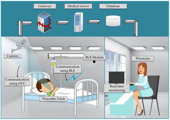 In our work, we assume an indoor scenario, wherein a patient is confined in an intensive or superficial care unit. An authorized person is remotely monitoring the patient’s health condition. We consider the transmission of ECG data, which particularly focus on heart rate variability. The proposed patch is connected to the ECG data sensing network. The signal is modulated in the LED or BLE and sent to the respective receiver. Static surveillance cameras are utilized to receive the LED data. Eventually, the data are transmitted to the authorized monitoring person using an eHealth gateway.