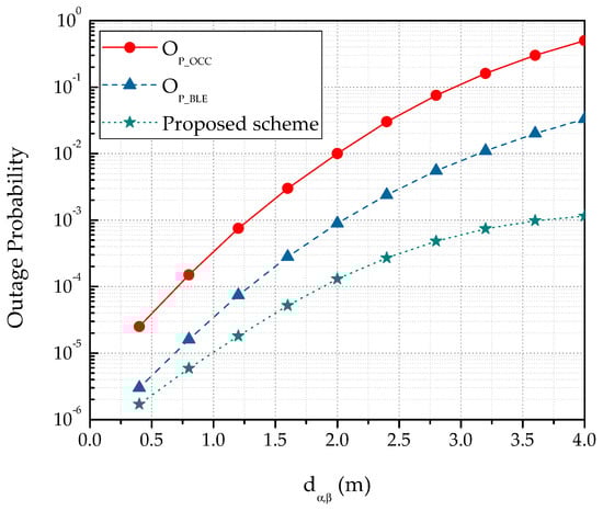 Figure 8. The outage probability of OCC is comparatively high. Several reasons can be addressed for the high outage probability of OCC. First, as most of the current commercial cameras have limited AOV, the overall coverage area is small. Second, data communication requires a LOS connection between the camera and the LED. Third, the optical signal in OCC is almost unaffected by the NLOS component. In