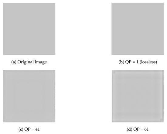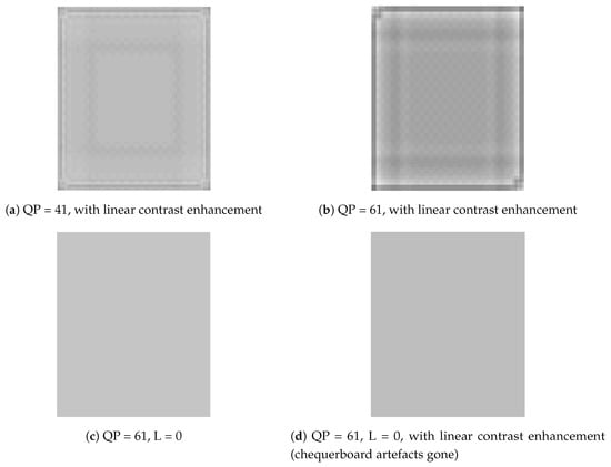 In Section 2.1, we learned that when QP > 1, values became distorted after the process of quantization and inverse quantization. We set instead of the LP value in Equation (11), which has been processed with the second-stage 4 × 4 PCT, . We then used QP = 61 to perform quantization and inverse quantization for Equations (11) and (12) (shown as ). The results are Equations (13) and (14), respectively. From the source code of DPK [26], we know that under 8-bit greyscale conditions, after undergoing linear adjustments (offset) with the DPK program, the result is ≤ 2048. From Figure 3, we can see that when QP = 61 and , , then . This means if we would like , , then ≥, or . From this, we learn that in the HP area of Equations (11) and (12), the values were adjusted to zero after the calculation, as they were too small (). At the end, only the LP portion, or the , of the top left corner remained, as shown in Equation (14).