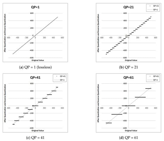 Quantization of DPK is lossless when the quantization parameter QP = 1, as shown in Figure 3a. When QP > 1, the result is similar to uniform quantization, as shown in Figure 3b–d. The solid lines are the quantization results of QP = 21, QP = 41, and QP = 61, respectively. It can be observed that as QP increases, the interval (step) becomes wider.