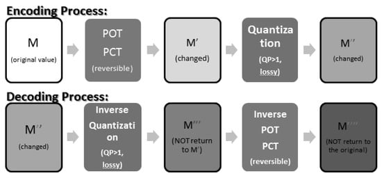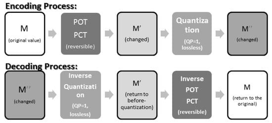 The process of JPEG-XR encoding is as shown in Figure 4. From [18], we know that the POT and PCT implemented by the lifting structure are “reversible”. This means that after a value has been transformed by POT or PCT, we can apply the corresponding inverse transforms to return it to its original value, as shown in Figure 5.
