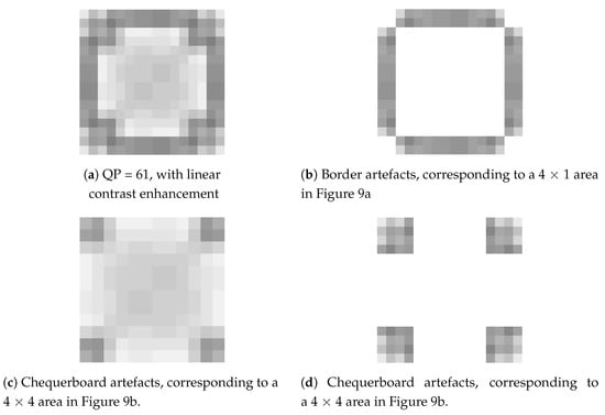 Considering the characteristics of quantization, when , . This means we can make where . Therefore, the result of Equation (22) can be reordered into Figure 19. Assuming , using greyscale representation, one can see that the top two rows (where 4 × 1 POT was applied) have lower values (dark grey). We only took half (4 × 2) of the bottom two rows (where 4 × 4 POT was applied), so only half of the chequerboard is shown here, but all the values in this area were higher than the top two rows (lighter grey). Up to now, we have explained the cause of border artefacts: this is due to different transformation values resulting from inverse 4 × 1 POT and inverse 4 × 4 POT.