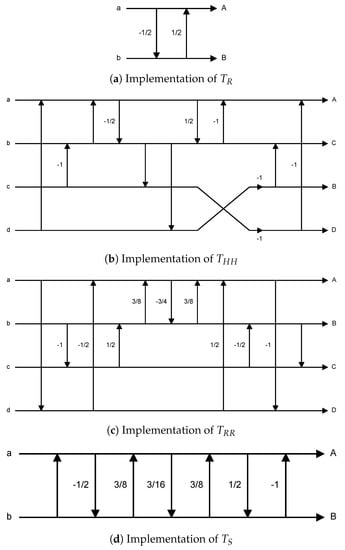 From [18], we know that the four rotational operators listed in Figure 12 are implemented by the lifting structure [24,25,27]. Its basic structure is as shown in Figure 13. The advantage of using the lifting structure is that the transform operations can be separated into simple addition, subtraction and multiplication (e.g., Figure 13a can be expanded into Equation (1)). Moreover, inverse transform operations can be achieved by simply reversing the operation order, and switching the pluses and minuses (e.g., Equation (2) is the result of expanding Figure 13b).