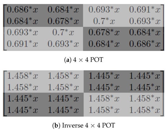 For the ease of implementation, we adjusted the uniform matrix into a fraction. We set the numerator to 256 () and took an approximate value. This way, we can implement using the integer data structure and bit shifting in the program in order to maintain accuracy and decrease complexity. Finally, we get Equations (29) and (30), which are respectively the uniform matrix and inverse uniform matrix of 4 × 4 POT.