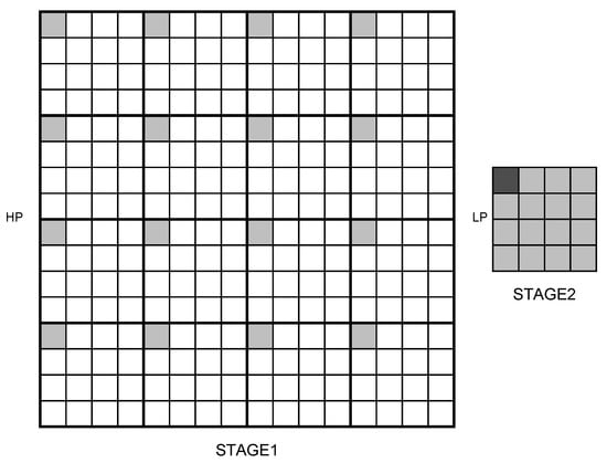 From [24], we know that JPEG-XR has a two-stage PCT, as shown in Figure 15. Each 4 × 4 block processes the first-stage PCT, resulting in an LP coefficient (light-grey) and 15 HP coefficients (white). Then, the second-stage transform was applied to the 16 DC coefficients collected into a single 4 × 4 block. These yielded 16 new coefficients, referred to the LP coefficient of the original block, respectively.