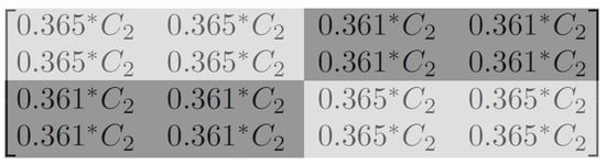 Next, we set and performed inverse second-stage PCT 4 × 4 transform on Equation (14) (shown as ). The result is Equation (15). One can observe that besides the four corners being , all other points were equivalent to .
