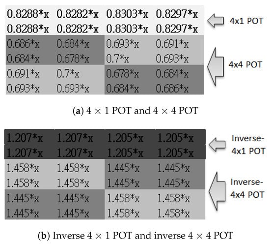 We combined the results of Equations (9), (10), (19) and (20) according to the upper boundary application area of Figure 9. The result is shown in Figure 18. The top two rows are the area where 4 × 1 POT was applied. The bottom four rows are where 4 × 4 POT was applied. One can see that in Figure 18, the value of 4 × 1 POT is bigger than the lower 4 × 4 POT (light grey). In Figure 18b, the value of inverse 4 × 1 POT is less than the lower inverse 4 × 4 POT (dark grey).