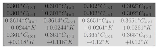 Combining Section 2.3 and Section 2.4, we simulated the top left 4 × 4 area of the image, i.e., not applying POT to the top left 2 × 2 corner, applying 4 × 1 POT to the top right and bottom left corners and applying 4 × 4 POT to the bottom right corner. The result is Equation (23).
