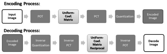From the analysis in Section 2, we discovered three problems in POT: (1) 4 × 4 POT is “uneven” (different values/non-uniform), which causes chequerboard artefacts; (2) the transform result value of 4 × 1 POT is greater than 4 × 4 POT, which causes border artefacts; and (3) POT was not applied on 2 × 2 areas in the four corners, which causes corner artefacts. To solve these problems, we propose the use of a “uniform matrix”. After the POT (encoding) step and before the inverse POT (decoding) step, our uniform matrix was multiplied to even things out. After applying our solution, the process is as described in Figure 20.