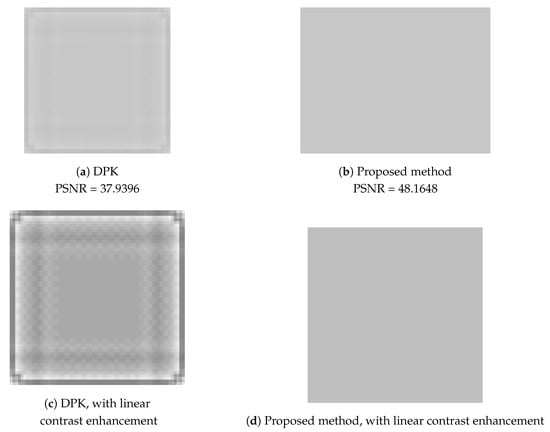 Figure 29b and Figure 31b are the result of Figure 26a using the “Lena” picture (512 × 512 pixel). Using our improvement method, the result was almost the same as the DPK when QP ≥ 50. The reason there was little room for improvement was that chequerboard, border and corner artefacts are insignificant for high-frequency images such as this one.