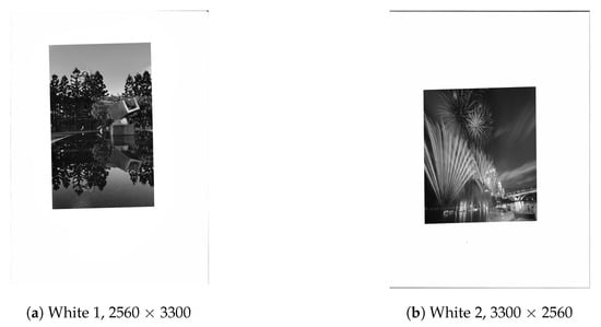A look at Equations (9) and (10) shows that both 4 × 4 POT and inverse 4 × 4 POT resulted in a chequerboard-like distribution, as shown in Figure 14. The values are displayed in greyscale. Assuming , in the 4 × 4 POT (Figure 14a), the top left and bottom right corners have lower values (colour is dark) while the top right and bottom left corners have higher values (colour is lighter). The inverse 4 × 4 POT, on the other hand, resulted in exactly the opposite chequerboard colours. The mirrored results appear in Figure 14b.
