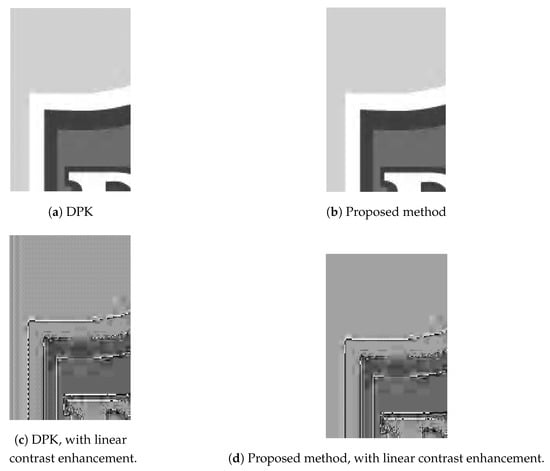 Figure 27 is the partial visual comparison of the logo image. Figure 27c,d is the result after linear contrast enhancement. One can clearly see that the artefacts appeared in the DPK result (c), and these have been completely eliminated by our proposed method (d).