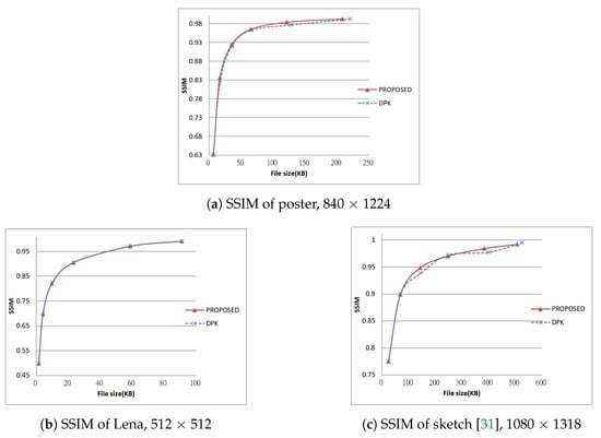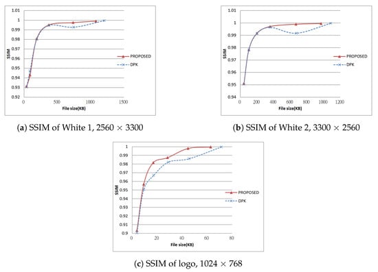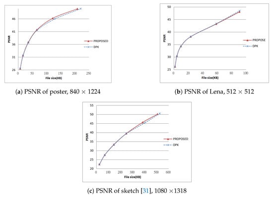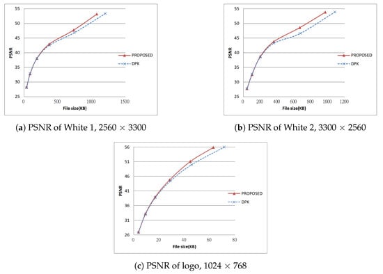 Figure 28a,b and Figure 30a,b are the results of Figure 24 respectively. These two images have wider white borders to simulate photo reproduction and scans. The results show that our improvement method yielded better performance when the compression ratio was medium to low (QP ≤ 41). PSNR increased by as much as 1.97 dB, while SSIM increased by as much as 0.00727. Moreover, when the compression ratio was low (QP ≤ 11), the resulting file size was as much as 10% smaller than DPK.