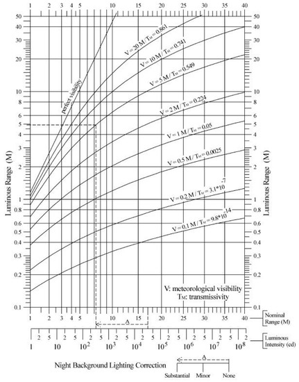 From Equation (5) it is possible to estimate the luminous range of a signal D, which can also be obtained with the diagrams given by the IALA (Figure 1) [3,11,12]: