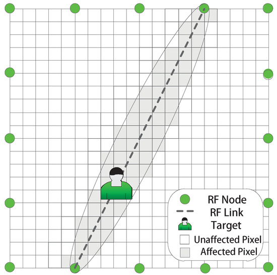 where is the length of the link i and and are the distance from the centroid of pixel j to the transmitter and receiver of link i. The parameter controls the range of the target-affected projection zone and only the pixels in the projection zone are considered as affected [2,26], as Figure 1 shows. The shadow fading induced by the target appearance will lead to the RSS variation of the RF link. Then, the prime goal of RTI is to reconstruct the image of shadow fading and infer the position of the target by solving the projection Equation (1) from the RSS . Due to the narrow-band property of the RF signal, the multipath noise in the sensing network increases the uncertainty of the measured RSS [8]. These interfered measurements induced by the multipath fading may degrade the reconstruction quality. Therefore, the multipath interference is a key problem in actual RF-based DFL applications.