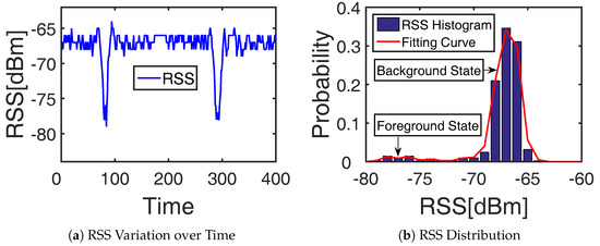 To figure out the informative RF links, it is important to analyze whether the RF link is affected by the target. Here, we give an analysis of an RF link that is crossed by a target twice. The RSS variation of this chosen link over time is shown in Figure 2a. The RSS varies a little within the difference of 3 dBm for most of the time when the target is far away from this RF link while the RSS decreases more than 15 dBm when the target comes close to this RF link. The histogram and fitting curve of the RSS distribution in Figure 2b show that the RF link will be in different states depending on whether it is target-affected or not. Thus, the issue of target-induced RF link recognition is actually the analytical problem of the RF link state. Considering the dynamic variation of the RF link state, background subtraction from computer vision [20] can be applied to this RF link state analysis [21]. The RF link state with high peak and low variance is treated as the static background state, and the other RF link state with low peak and large variance is regarded as the dynamic foreground state [22], as Figure 2b shows. Then, the target-induced RF link recognition can be realized by the background and foreground decomposition of the RF link state.