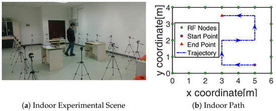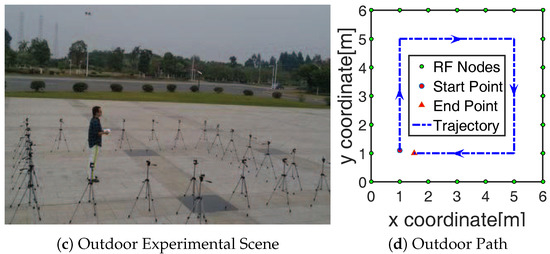 The experiments were deployed in a 4 m × 4 m indoor scene with 20 RF nodes and a m6 m outdoor scene with 24 RF nodes in Sun Yat-sen University, shown in Figure 3a,c The RF nodes along the boundary at a height of 1 m with an interval of 1 m were the Crossbow MICAz devices, which communicate with a -GHz IEEE standard and are suitable for RTI research [2,7]. A token ring protocol was used so that each RF node transmitted the RF signal in sequence according to the predefined ID number. When an RF node was transmitting the signal, the rest of the RF nodes remained in receiver mode and recorded the RSS measurements from the received packets. A MIB520CB base station made by Crossbow overheard all the packets and passed them to a computer for storage. The period for token transmission was 120 ms. Before the localization experiment, the baseline RSS value , which reflects the RSS in the empty monitored area, was calculated as the average RSS measurements of 5 min before the target entered the scene. During the localization experiment of each position, the RSS averaged over a 30-s period was used as the measured RSS value . Then, the RSS for RF link state analysis and BRTI reconstruction was . The parameter , which is reasonable to reflect the target-affected projection area as discussed in [11]. The size of a pixel in the sensing area was m m, and the total pixel number in the indoor and outdoor scene was and , respectively. The number of RF links in the indoor and outdoor scene was and , respectively. Then, a target moved with a uniform motion along the prescribed destination path inside the network, as the blue trajectory line shown in Figure 3b,d. The total number of sampled points for tracking in the indoor and outdoor scene was and , respectively.