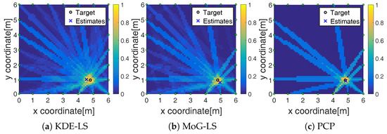 After the foreground-state RF links have been recognized, the image of shadow fading can be reconstructed by BRTI from the obtained foreground-state RF links. In the above example, when the target moves to the point in the outdoor scene, Figure 3d, the images of shadow fading reconstructed based on the recognized RF links are shown in Figure 5. From these results, the fewest foreground-state RF links estimated by the proposed PCP method were sufficient to reconstruct the image of shadow fading without bringing in the noise-induced artifact, meaning that the RF links recognized by PCP effectively reflected the target-induced shadow fading. Besides, the target position was computed as the coordinate with the maximum in the estimated image of shadow fading as:
