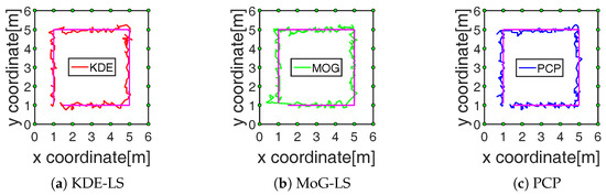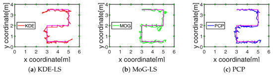 The performance of these methods in the tracking process, including 250 and 400 points in the indoor and outdoor scene, respectively, were compared with the tracking results presented in Figure 6 and Figure 7. The average calculating time and the average tracking error in the total tracking process by these methods are recorded in the fourth and fifth row of Table 1. On the one hand, the time consumption of PCP was decreased by at least 33% and 53% compared to KDE-LS and MoG-LS. On the other hand, the localization accuracy of PCP was increased by at least cm and cm compared to the other methods. These results demonstrate that the recognition of the foreground RF links by PCP was effective and efficient to reflect the target-induced shadow fading. Meanwhile, KDE-LS and MoG-LS, based on the temporal distribution estimation and the spatial link subtraction led to the higher error and more computation than PCP. This is because the time window of the distribution estimation in KDE-LS or MoG-LS cannot be adaptively changed to sense the time-varying scene, and the spatial link subtraction for the overall calculation was not only time-consuming, but also ineffective for the RF links that still existed in the sensing area. In contrast, the low-rank and sparse decomposition of the measured RSS matrix by PCP can precisely sense the spatiotemporal variation of shadow fading simultaneously. Thus, more accurate position information of shadow fading can be found by the proposed method.
