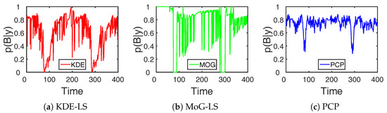 Moreover, the sensitivity analysis of the RF link state was conducted to demonstrate the fine-grained perception ability of these methods. The background-link state probability (13) in the RF link state decomposition was used to approximate the real-time RSS variation of the RF link. To analyze the RF link RSS variation in Figure 2a, the background-link state probability estimated by these methods is shown in Figure 8. The Pearson correlation coefficient is a measure of the similarity between the background-link state probability and the RSS change, with the results recorded in the fourth row of Table 1. From the graph and correlation results, the background-link state probability estimated by PCP was the closest to the RSS change with the highest Pearson correlation coefficient. These results indicate that the proposed PCP method accurately recognized the large RSS change by the target appearance and was insensitive to the small RSS change caused by the environmental noise. Thus, this RF link recognition by the low-rank and sparse decomposition was informative and robust to the multipath interference.