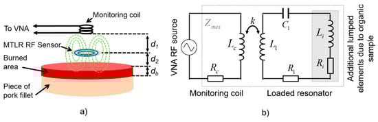 The dependence of Ri on the electrical conductivity and the dependence of Li on the dielectric constant were theoretically established in reference [] for volume RF resonators such as a multi-gap parallel plate cylindrical resonator. More precisely, Ri was found to be proportional to the tissue conductivity, and Li was found to be proportional to the dielectric constant of the tissue. These conclusions were experimentally confirmed in reference []. These features were also computationally assessed for flat circular antennas such as MTLR in reference [] and experimentally verified with reference liquids used as test samples in another study []. Here, the monitoring coil is a 8 mm-diameter, 11 mm-height copper–wire bobbin coil, modelled by resistance Rc (50 Ω) in series with inductance Lc (0.22 µH). The bobbin coil is placed at a distance d1 = 16 mm from the MTLR. It is electromagnetically coupled to the MTLR (Figure 1a) and connected to the VNA. The MTLR is placed at a distance d2 = 2 mm from the sample. Finally, the coupling between the monitoring coil, the MTLR, and the tissue under evaluation is modelled by the equivalent circuit depicted in Figure 1b.