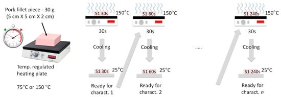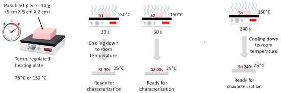 The samples were burned on one face by contact with a plate heated at 75 °C or 150 °C, with heating durations tH = 30, 60, 120, and 240 s. Also, two different heating procedures were used. In the continuous heating procedure (CHP), the samples were heated from t = 0 s to t = tH without interruption (Figure 2). The CHP samples were then cooled down to ambient temperature (25 °C) and measured using the RF probe. In the interrupted heating procedure (IHP), the samples were heated first from t = 0 s to t = 30 s, cooled down, and measured, and then heated again for 30 s, cooled down, and measured, and so on (Figure 3). Figure 4 shows examples of samples prepared with IHP.