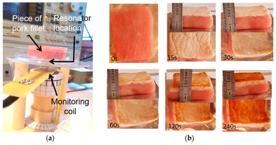 (a) Radiofrequency (RF) measurement set up; (b) Examples of low-fat pork filet samples, raw and burned during up to 240 s using the interrupted heating procedure.