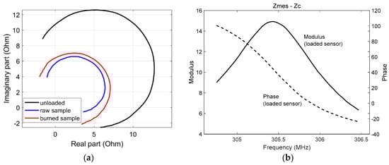 (a) Equivalent impedance Zmes − Zc obtained when the RF probe was unloaded and loaded with the raw and burned samples. The impedance changes are presented in the complex plane in a 304.6–306.4 MHz frequency bandwidth; (b) Modulus and phase of the equivalent impedance Zmes − Zc of the RF resonator when loaded with the sample versus frequency in a 304.6–306.4 MHz bandwidth.