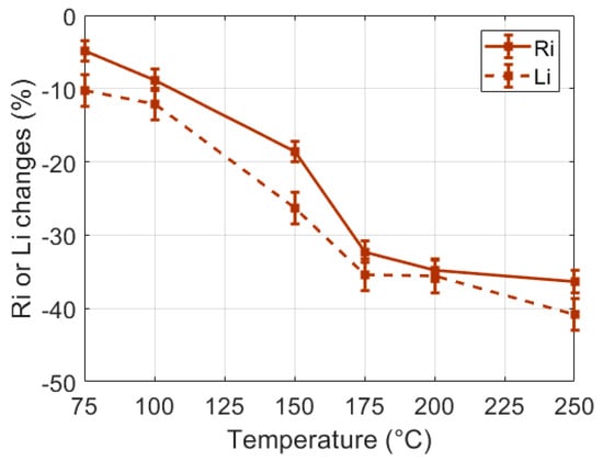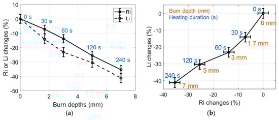 The relative variations of Ri and Li, estimated from data measured in IHP samples heated at a 150 °C temperature, are shown in Figure 6. Each point on these graphs results from the averaging of nine estimations carried out on three different samples prepared with the same procedure; the error bars are the standard deviation of the estimations. Furthermore, each type of sample was cut after the RF measurements in order to estimate the actual burn depth by means of microscope observations. Ri and Li changes in the burned tissues were significant, with differences of −30% and −40%, respectively, observed in a sample heated at 150 °C for 240 s.