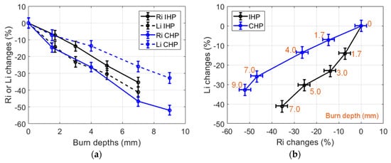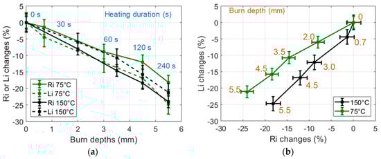 CHP and IHP were carried out at 150 °C and up to 240 s in small (30 g) samples. The resulting burned samples were measured using the proposed non-contact sensing method. The obtained results are presented in Figure 9. It can be observed that the used heating procedures resulted in different burn depth after a 240 s heating duration (9 mm for CHP and 7 mm for IHP). Furthermore, CHP burns featured large Ri changes (over 50% reduction) and smaller Li changes (over 30% reduction).