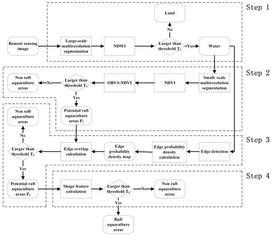 The new proposed method requires four main steps as shown in a technical flowchart (Figure 1). Step 1: Separate water and land by threshold segmentation of the normalized difference water index (NDWI). Step 2: Calculate the OBVS-NDVI and then extract potential raft aquaculture areas P1 based on the threshold. Step 3: Conduct edge detection first; then extract the potential raft aquaculture areas P2 by the degree of edge overlap and OBVS-NDVI features of the raft aquaculture area. Step 4: Reprocessing selection by shape feature. Details of these steps are described below.
