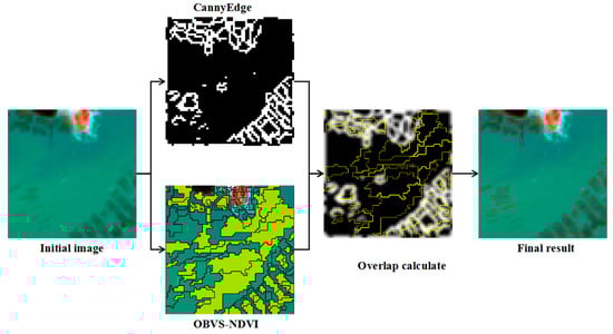 The diagram of raft aquaculture extraction based on edge overlapping is shown in Figure 2. First, Canny edge (https://en.wikipedia.org/wiki/Canny_edge_detector) and OBVS-NDVI features are extracted from the initial image, and then they are overlapped. The overlap probability of edge pixels between Canny edge and OBVS-NDVI features is calculated, and the regions with a degree of overlap greater than T3 are identified as potential raft aquaculture areas P2. Details of these steps are described below.