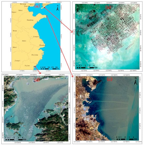 Aquaculture is one of the fastest growing food production sectors worldwide, an important source of food in many countries, the main protein source for hundreds of millions of people, and has been in the spotlight for its potential to support future food security at a global scale []. According to the United Nations Food and Agriculture Organization (FAO) human consumption of farmed aquaculture species exceeded that of capture fisheries for the first time in 2014; in particular, Asia alone generates 90% of the total global aquaculture volume []. Coastal raft aquaculture, as one of the most popular industries in coastal areas, plays an important role in regional aquaculture production []. However, the negative environmental and social effects of aquaculture have overshadowed the opportunities for employment, income, and foreign exchange from coastal aquaculture. The environmental impacts include mangrove loss, bycatch during collection of wild seed and broodstock, introduction and transfer of species, spread of parasites and diseases, misuse of chemicals, and release of wastes. The socioeconomic impacts include privatization of public lands and waterways, loss of fisheries livelihoods, food insecurity, and urban migration []. Moffitt et al. [] explored ecosystem approaches to aquaculture including addressing climate change, ecosystem restoration, protected areas, and control of invasive species, and then integrated aquaculture assessments and exchanges into an integrated framework. They pointed out that the main challenge of aquaculture governance is to ensure that effective measures are taken to ensure environmental sustainability without undermining aquaculture initiative and social harmony. The FAO and UNEP [] has pointed out that the effects of pollution from coastal raft aquaculture are limited but incremental and cumulative, and it often takes place in areas where resource ownership or use rights are ill defined and ambiguous. So, in the future development of coastal raft aquaculture areas, selecting suitable aquaculture sites and rationally arranging the spatial distribution of the raft aquaculture areas will help to protect resources in different regions. Gao et al. [] analyzed the spatial information dynamic remote sensing of the Zhujiang River Estuary aquaculture development, and comprehensively obtained the regional differences in the distribution of the aquaculture areas, which are related to the economic and spatial development needs of different regions. Xia et al. [] discussed a method for estimating the pollution load of different aquaculture types, and analyze the spatial distribution characteristics in typical bay, taking the Zhelin Bay in Guangdong Province as an example, which provided a scientific basis for pollution monitoring and production regulation of coastal raft aquaculture. All of these are about an important piece of information: the spatial distribution information of coastal raft aquaculture areas.