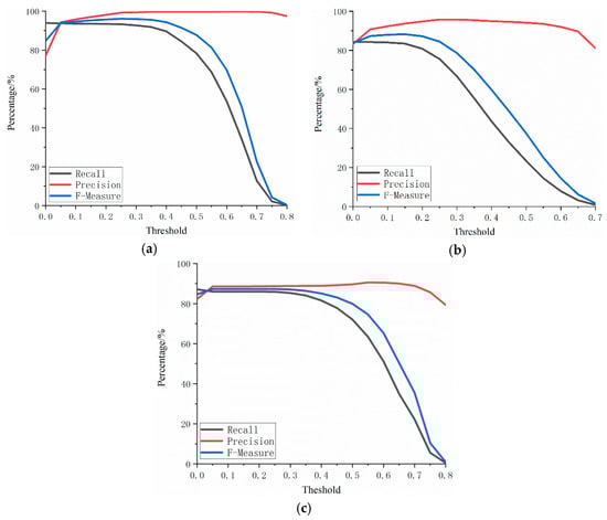 Commonly used performance measures [], including Recall, Precision, and F-Measure, were employed to evaluate the accuracy of the method employed here using Equations (8)–(10), respectively: