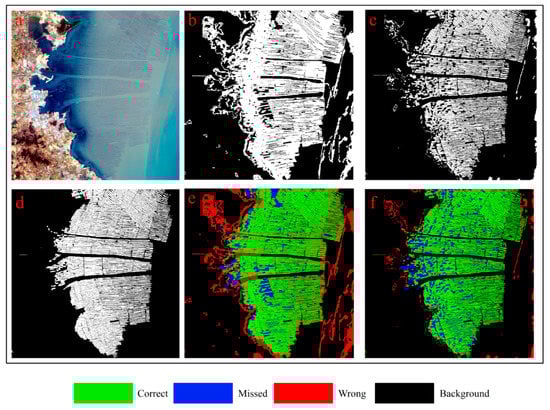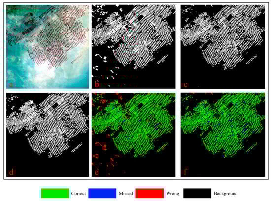 Results of two experimental methods for study area 3: (a) Initial image; (b) OBVS-NDVI extraction result; (c) Proposed extraction result; (d) Human interpretation result; (e) Overlap of OBVS-NDVI result with human interpretation result; (f) Overlap of proposed result with human interpretation result.