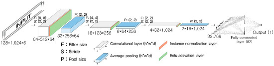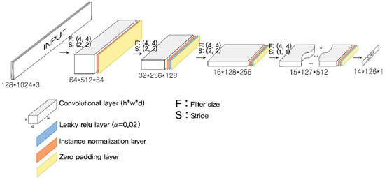 The discriminator includes 4 convolutional blocks, each of which is composed of a convolutional layer, an instance normalization layer, and a leakyReLu activation layer. The leakyRelu converts negative input to a small positive value rather than suppressing the value to 0, which also considerably improves the performance of a deep neural network [36]. The discriminator showed better performance when a PatchGAN was adopted [37,38,39]. Accordingly, a two-dimensional tensor output (e.g., 14 × 126) was used for the discriminator rather than a single entropy output, so that each element of the tensor output could judge whether a part of the input image was true or synthesized. The ground-truth label had the same dimensions and was filled with binary values according to whether or not an input image was real. Figure 5 shows the chosen architecture of the discriminator networks.