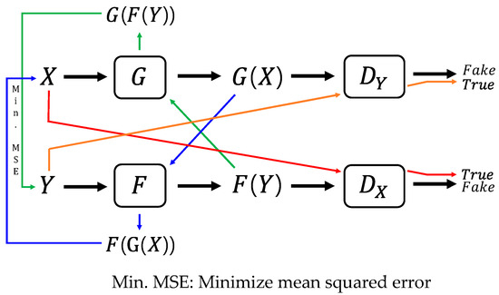 The goal of a CycleGAN is to train the generator to create images that the discriminator could not distinguish as synthesized. The loss function was set up to fulfill this objective. First, the adversarial loss for both mapping functions was established, expressed by Equations (3) and (4), respectively, to be maximized during learning. The first term of the loss function represents the log-likelihood that a real image in a domain is proven to be real, whereas the second term stands for the log-likelihood that a synthesized image turns out to be synthesized. The loss function takes the average of individual log-likelihoods across a sample extracted from the true probabilistic density of each domain: