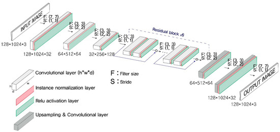 The architecture of the generator was chosen after testing as many plausible alterations as possible, beginning with the model structure established originally by Johnson et al. [34]. The generator network was deeper than the discriminator network and included both convolutional and deconvolutional blocks (see Figure 4). The convolutional blocks extract features from an input image. The deconvolutional blocks attach to the end of the final convolutional block to rebuild an output image with the same dimensions as the input image, and preserve the features extracted by the former convolutional blocks. A convolutional block consists of three layers: a convolutional layer, an instance normalization layer, and a Relu activation layer.