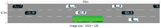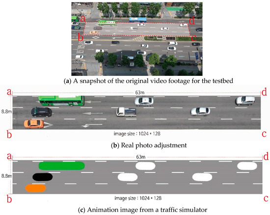 Figure 6c shows a sample animation image generated from traffic simulation that mimics the real traffic of the testbed. It is very important to match the scales of the two images (Figure 6b,c). The adjusted photo (1024 × 128) covers a real road segment 63 m long and 8.8 m wide. The latter animation image was generated on the same scale, so that distances in the former image would be consistent with those in the latter image.