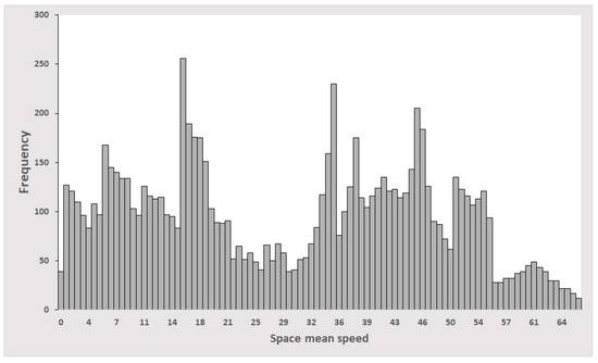 The simulation period was set identical to the duration of the video (=4 h). Nine thousand pairs of images (=2 × 9000 images) were selected randomly from the simulated animation. Figure 6c shows a typical example of an animation image. A resolution of 128 × 1024 was commonly applied to both the real and animation images. These animation images had exact labels of space mean speeds extracted from the simulator. Figure 7 shows the distribution of space mean speeds for the chosen 9000 pairs of consecutive images. The space mean speed ranged from 0 to 67 KPH, which was consistent with the real traffic conditions in the testbed.